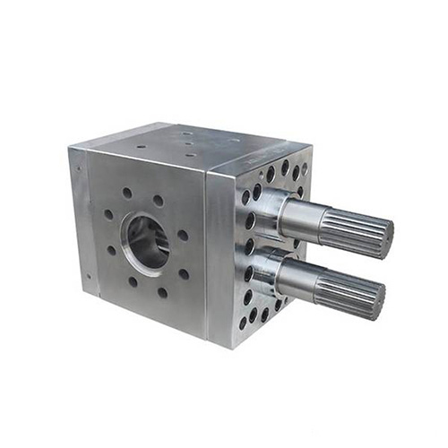 與單驅動熔體泵結構類似,雙驅動熔體泵也主要由泵體、前后側板、兩個相互嚙合的齒輪、軸承和密封件、加熱冷卻件等組成,區別在于,雙驅動熔體泵的兩個齒輪軸都是主動輪,在輸入端與電機的減速箱連接,兩齒輪轉子之間為嚙合但齒面為非接觸狀態。